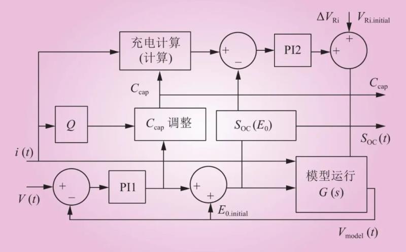 現(xiàn)應(yīng)用工程一般使用安時(shí)積分法進(jìn)行SOH狀態(tài)估計(jì),但該方法沒有考慮電池多次循環(huán)后內(nèi)部材料的退化、計(jì)算損耗等問題,需要頻繁進(jìn)行校準(zhǔn)。由此,本文加入一種新的SOC和SOH估計(jì)策略,基于電池二階電路模型,對電池電壓的測量值和計(jì)算值之間進(jìn)行實(shí)時(shí)比較,結(jié)合PI控制器,提供更準(zhǔn)確的狀態(tài)估計(jì)值。
