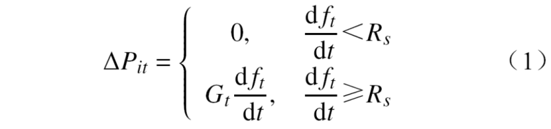 (2)當(dāng) Δf>0 且頻率變化率為負(fù) (dft/dt<0) ,若頻率變化率的絕對值超過了虛擬慣性控制死區(qū) Rs ,此時(shí)虛擬慣性控制啟動(dòng),所有儲能單元按照式(1)計(jì)算出力,同時(shí)響應(yīng)電網(wǎng)一次調(diào)頻。