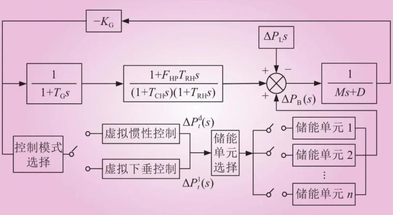 其中, s 為拉氏算子;KG 為傳統(tǒng)發(fā)電機(jī)組的單位調(diào)節(jié)功率;TG、TCH、TRH 分別為傳統(tǒng)發(fā)電機(jī)組的調(diào)速器時(shí)間常數(shù)、汽輪機(jī)時(shí)間常數(shù)、再熱器時(shí)間常數(shù);FHP 為再熱器增益;ΔPL(s) 為負(fù)荷擾動(dòng)量;ΔPB(s) 為儲能系統(tǒng)出力;圖片為虛擬慣性控制出力;圖片為虛擬下垂控制出力;M 為電網(wǎng)慣性時(shí)間常數(shù);D 為負(fù)荷阻尼系數(shù)。