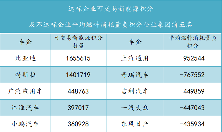 值得注意的是,達(dá)標(biāo)企業(yè)中可交易新能源積分?jǐn)?shù)量前五名的企業(yè)集團(tuán)分別為比亞迪(SZ002594,股價336.10元,市值9784億元)、特斯拉(TSLA,股價699.20美元,市值7244億美元)、廣汽乘用車、江淮汽車(SH600418,股價17.43元,市值380.67億元)和小鵬汽車(HK09868,股價125.60港元,市值2161億港元)。其中,比亞迪和特斯拉大幅領(lǐng)先其他車企,可交易的新能源積分?jǐn)?shù)量分別為165.6萬分和140.2萬分。