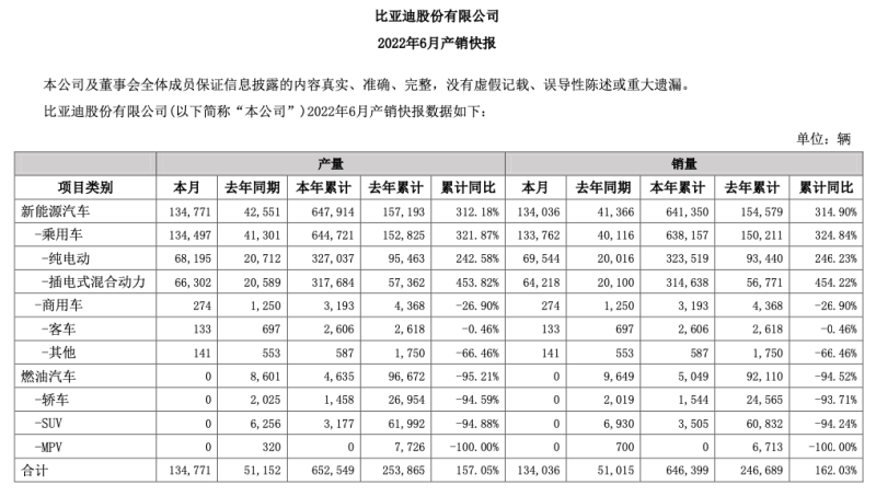 比亞迪官方數(shù)據(jù)顯示,6月,比亞迪新能源汽車銷售約13.4萬輛,同比增長162.7%。這是比亞迪自3月份宣布停產(chǎn)燃油車后,連續(xù)第4個(gè)月實(shí)現(xiàn)月銷量突破10萬輛。