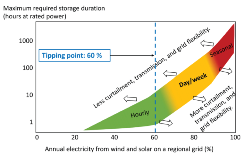 圖4:Y軸顯示了確保滿足需求所需最長(zhǎng)的儲(chǔ)能持續(xù)時(shí)間(對(duì)數(shù)標(biāo)度)與區(qū)域/地方層面的可再生能源發(fā)電設(shè)施(風(fēng)電和太陽(yáng)能)的年度能源比例。箭頭表示限電、輸電和電網(wǎng)靈活性的保守(左側(cè))或激進(jìn)(右側(cè))的假設(shè)