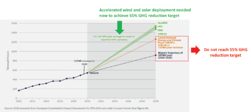 圖3 到2030年歐盟實(shí)現(xiàn)55%碳排放目標(biāo)所需增長(zhǎng)的風(fēng)力發(fā)電量和太陽(yáng)能發(fā)電量