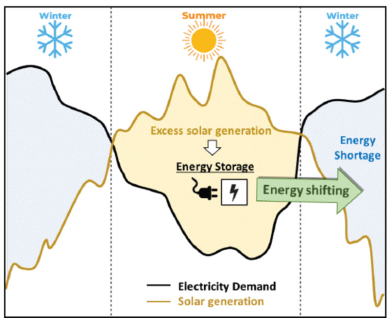 圖2 歐洲一年內(nèi)的電力需求(黑線)和太陽(yáng)能發(fā)電設(shè)施供電(黃線)的季節(jié)性相關(guān)性。黃色陰影表示使用儲(chǔ)能技術(shù)存儲(chǔ)的多余太陽(yáng)能發(fā)電量,這種電力的使用被“轉(zhuǎn)移”以滿足冬季的高需求。