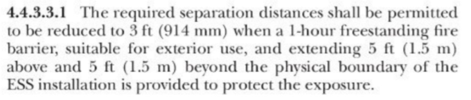 需要說明的是,當不滿足相關(guān)防火距離要求時,一般可通過設置防火墻進行隔離。例如電池艙之間不滿足3m的要求時,可設置防火墻,防火隔墻的超過外輪廓投影范圍外側(cè)各1m。對比NFPA855第4.4.3.3.1條的要求,防火隔墻需超過兩側(cè)和高度各1.5m。