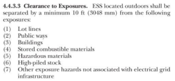 參照美國國家標準NFPA855防火距離相關(guān)要求,電池艙距建筑物、易燃性材料等距離為3.048m,遠小于國內(nèi)標準要求。
