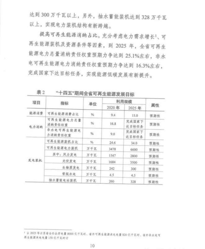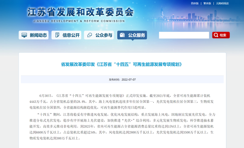 據(jù)悉,“十四五”期間,江蘇將穩(wěn)妥有序推進風電發(fā)展,優(yōu)化風電發(fā)展結構,重點發(fā)展海上風電,因地制宜發(fā)展光伏發(fā)電,全力推進分布式光伏發(fā)電,穩(wěn)步有序開展海上光伏建設,加快推進“光伏+”綜合利用,多元化發(fā)展生物質發(fā)電,科學推進抽水蓄能開發(fā),高效多元推動非電利用。到2025年,江蘇省內可再生能源占全省能源消費總量比重將達到15%以上,可再生能源裝機達到6600萬千瓦以上,占總裝機比重超過34%。其中,風電裝機達到2800萬千瓦以上,光伏發(fā)電裝機達到3500萬千瓦以上,生物質發(fā)電裝機達到300萬千瓦以上。