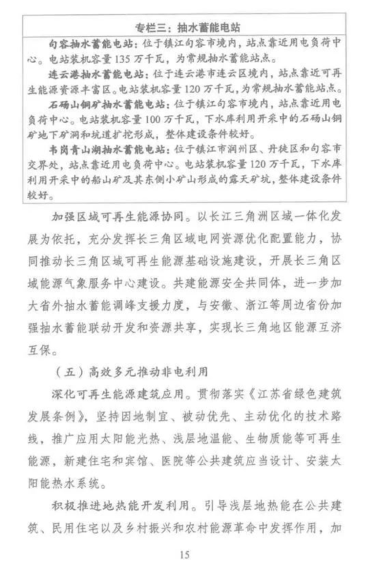抽水蓄能方面,《規(guī)劃》提出,要加快省內資源普查和選點規(guī)劃,積極推進句容抽水蓄能電站建設,開展連云港抽水蓄能電站前期工作并力爭開工建設,開展句容石碭山銅礦抽水蓄能電站和韋崗青山湖抽水蓄能電站前期工作,加強區(qū)域可再生能源協(xié)同,進一步加大省外抽水蓄能調峰支援力度,與周邊省份加強抽水蓄能聯(lián)動開發(fā)和資源共享。
