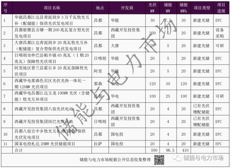 在11月底并網(wǎng)的明確要求下,西藏的光儲項目已進入集中啟動階段。根據(jù)儲能與電力市場的統(tǒng)計,目前已有11個項目相繼開始可研或EPC招標,總規(guī)模達到98.5MW/410MWh,涉及新建光儲項目和已有光伏增配儲能。具體項目清單見文章末尾表格。