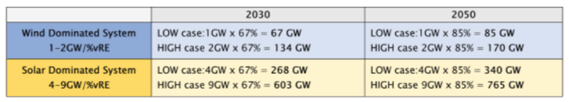 表1使用參考文獻計算的儲能功率容量,2030年67%的可再生能源發(fā)電份額和2050年85%的份額