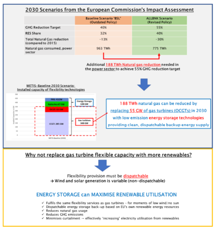 正如REPowerEU計劃和其他研究報告強調的那樣,儲能技術是基于歐盟自身可再生能源資源提供清潔可靠的備用能源的天然氣發(fā)電廠的替代解決方案。例如美國和澳大利亞致力于將電池儲能系統(tǒng)取代天然氣發(fā)電廠。英國最近的研究還表明,到2030年,將有50TWh的天然氣可能被長時儲能技術所取代,從而有效地減少碳排放,最大限度地減少棄電,并最大限度地提高可再生能源的發(fā)電量。在這里使用同樣的理由來減少歐盟的天然氣使用量,到2030年,根據影響評估的數據,歐洲儲能協(xié)會確定了2030年必須從電力部門消除的天然氣發(fā)電量,以符合歐盟制定的55%的溫室氣體減排目標。