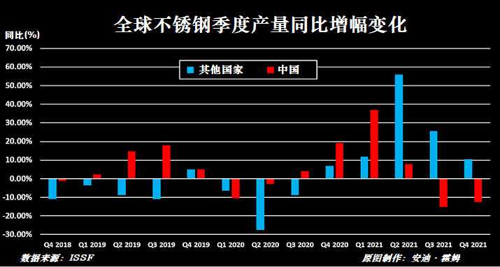 INSG去年4月曾預(yù)測(cè),2021年疫情過(guò)后全球鎳需求量將回升9%。但事實(shí)上回升速度遠(yuǎn)超預(yù)期。不銹鋼仍然是鎳消費(fèi)最大驅(qū)動(dòng)力,去年全球不銹鋼產(chǎn)量達(dá)到5630萬(wàn)噸,增幅10.6%,國(guó)際不銹鋼協(xié)會(huì)(ISSF,International Stainless Steel Forum)的數(shù)據(jù)顯示。世界最大不銹鋼生產(chǎn)國(guó)中國(guó)去年下半年經(jīng)歷大幅下降,導(dǎo)致全年產(chǎn)量增幅只有1.6%。不過(guò),其他國(guó)家產(chǎn)量則出現(xiàn)大幅增長(zhǎng),歐洲呈現(xiàn)2010年以來(lái)的最快增幅,除中國(guó)之外的亞洲國(guó)家增幅飆升21.2%。