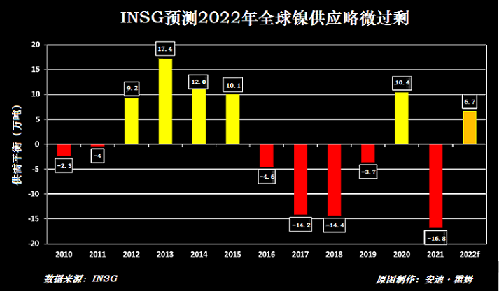 INSG預(yù)計(jì)今年消費(fèi)量將再增長(zhǎng)8.6%,歷史上首次超過(guò)300萬(wàn)噸。不過(guò),即使快速擴(kuò)大也不能跟上INSG預(yù)計(jì)的供應(yīng)增長(zhǎng)速度。INSG預(yù)計(jì),在印度尼西亞新增產(chǎn)能的推動(dòng)下,全球鎳供應(yīng)量預(yù)計(jì)將大幅增長(zhǎng)18.2%。INSG預(yù)測(cè),今年將重現(xiàn)略微過(guò)剩狀態(tài),大約過(guò)剩6.7萬(wàn)噸,但是否導(dǎo)致價(jià)格下跌仍存在爭(zhēng)議。