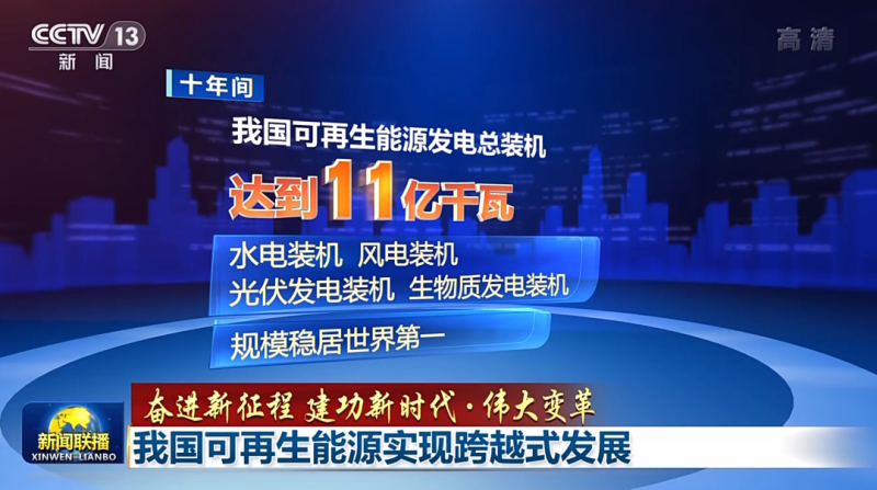 十年間,我國可再生能源發(fā)電總裝機達到11億千瓦,水電、風電、光伏發(fā)電、生物質(zhì)發(fā)電裝機規(guī)模穩(wěn)居世界第一。其中,風電光伏并網(wǎng)裝機合計6.7億千瓦,是2012年的近90倍。