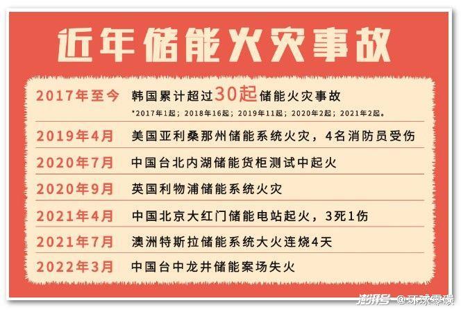 2019年4月,美國亞利桑那州儲能火災(zāi),造成四名消防員受傷;2021年北京大紅門儲能電站起火爆炸,一名值班電工遇難、二名消防員死亡、一名消防員受傷;2021年7月底,在澳大利亞維多利亞州世界上最大的電池基地之一的特斯拉Megapack儲能系統(tǒng)發(fā)生爆燃,延燒了四天;今年3月底,中國臺灣龍井儲能案場也發(fā)生失火意外……