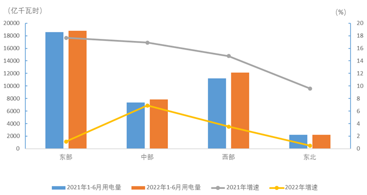 1-6月,東、中、西部和東北地區(qū)②全社會用電量分別為18794、7844、12104和2235億千瓦時,增速分別為1.1%、6.9%、3.5%和0.5%。