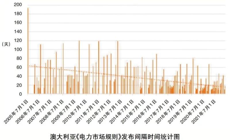 國際上,成熟市場擁有良好的規(guī)則管理機制和經(jīng)驗。澳大利亞依據(jù)“維護消費者利益,兼顧能源價格和質(zhì)量,保障安全可靠供應”的原則修編《國家電力規(guī)則》。自2005年實施以來,《國家電力規(guī)則》已發(fā)布182版,平均適用時間約34天,規(guī)則最長更新周期為194天(第一次修訂),最短僅為1天(見下圖)。近年來,隨著市場的不斷完善,規(guī)則發(fā)布周期越來越短。加拿大安大略省遵循“效率、公平、公開、全面、可靠性和可執(zhí)行性”原則對《電力市場規(guī)則》進行編制和修改,于1999年發(fā)布首版,現(xiàn)行規(guī)則采用的是2022年6月1日發(fā)布的第47.1版。規(guī)則中,“xx.1”表示此版本為批準的有效版本,“xx.0”表示此版本中含有建議修改的條文,最終條文由待獨立電力系統(tǒng)運營商(Independent Electricity System Operator,IESO)董事會批準生效。根據(jù)IESO網(wǎng)站發(fā)布的信息,《電力市場規(guī)則》半年修訂一次,基本固定于每年6月、12月的月初向市場主體公布并執(zhí)行。