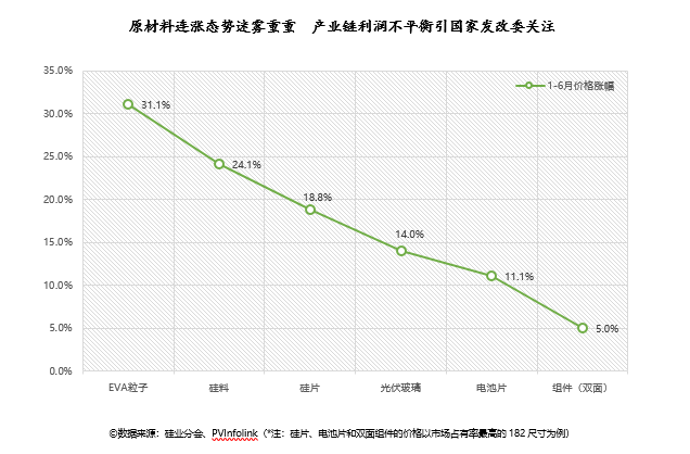 與此同時,上游原材料價格頻繁上漲而產(chǎn)生的傳導效應(yīng),已引起國家發(fā)改委的高度重視。6月22日,國家發(fā)改委高技術(shù)司組織召開光伏產(chǎn)業(yè)發(fā)展形勢座談會,全面梳理產(chǎn)業(yè)發(fā)展形勢,分析企業(yè)生產(chǎn)經(jīng)營、產(chǎn)業(yè)投資、產(chǎn)能建設(shè)、市場供需等方面面臨的問題,研究推進光伏產(chǎn)業(yè)健康持續(xù)發(fā)展的措施建議。