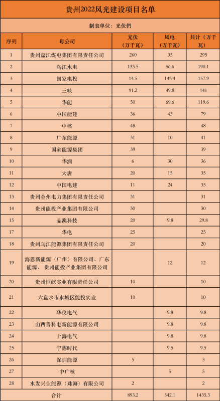 根據(jù)光伏們統(tǒng)計(jì),在此次光伏項(xiàng)目建設(shè)名單中,貴州盤(pán)江煤電集團(tuán)、烏江水電、三峽集團(tuán)分別以260萬(wàn)千瓦、133.5萬(wàn)千瓦、92.1萬(wàn)千瓦位居前三。其中貴州盤(pán)江煤電集團(tuán)有限責(zé)任公司是從屬于貴州省國(guó)資委的國(guó)有控股公司,貴州烏江水電是由中國(guó)華電集團(tuán)有限公司(51%)和貴州烏江能源投資有限公司(49%)聯(lián)合控股的子公司。