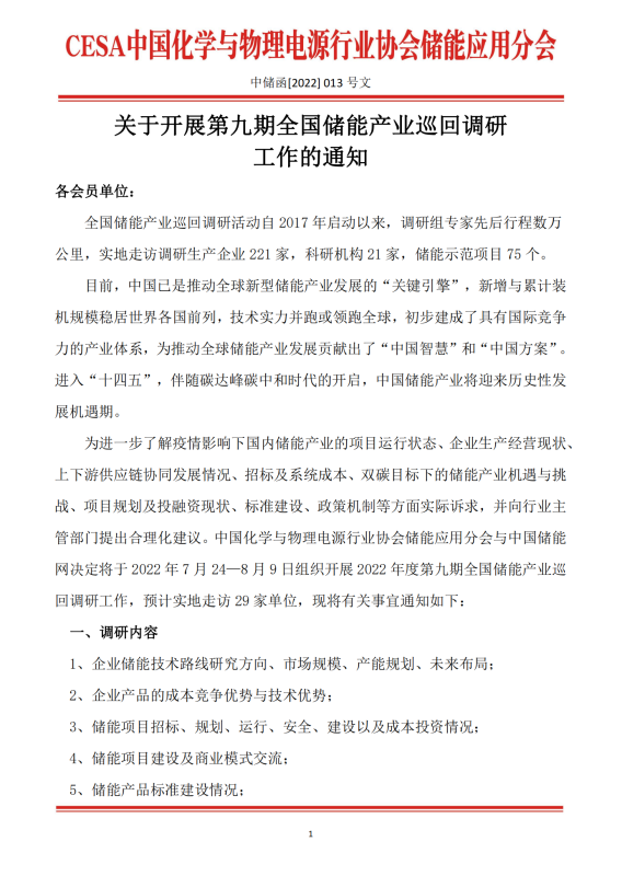 為進(jìn)一步了解疫情影響下國(guó)內(nèi)儲(chǔ)能產(chǎn)業(yè)的項(xiàng)目運(yùn)行狀態(tài)、企業(yè)生產(chǎn)經(jīng)營(yíng)現(xiàn)狀、上下游供應(yīng)鏈協(xié)同發(fā)展情況、招標(biāo)及系統(tǒng)成本、雙碳目標(biāo)下的儲(chǔ)能產(chǎn)業(yè)機(jī)遇與挑戰(zhàn)、項(xiàng)目規(guī)劃及投融資現(xiàn)狀、標(biāo)準(zhǔn)建設(shè)、政策機(jī)制等方面實(shí)際訴求,并向行業(yè)主管部門(mén)提出合理化建議。中國(guó)化學(xué)與物理電源行業(yè)協(xié)會(huì)儲(chǔ)能應(yīng)用分會(huì)與中國(guó)儲(chǔ)能網(wǎng)決定將于2022年7月24—8月9日組織開(kāi)展2022年度第九期全國(guó)儲(chǔ)能產(chǎn)業(yè)巡回調(diào)研工作,預(yù)計(jì)實(shí)地走訪29家單位,現(xiàn)將有關(guān)事宜通知如下: