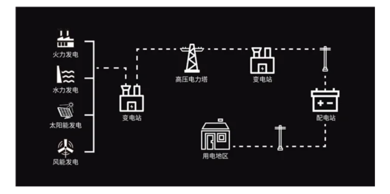 從傳統(tǒng)意義講,電一般都是由發(fā)電廠來(lái)發(fā)出的,主要包含水力發(fā)電,風(fēng)力發(fā)電,火力發(fā)電和太陽(yáng)能發(fā)電等等。發(fā)出來(lái)的電經(jīng)過(guò)高壓線路傳輸?shù)接秒姸?由于遠(yuǎn)距離的傳輸會(huì)存在著一些損耗,損耗來(lái)源主要為線路電流的大小,功率不變的情況下,電壓越高,電流就越小,損耗也就越小,因此根據(jù)不同輸電線路的要求,發(fā)電端的電由變電站將電壓升高,通過(guò)輸電站傳輸?shù)接秒姷貐^(qū)。然后經(jīng)過(guò)用電地區(qū)的降壓變電站的逐級(jí)降壓,最后通過(guò)配電傳到用戶(hù)家中。