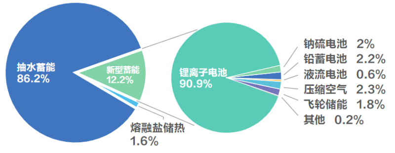新型儲能的累計裝機規(guī)模緊隨其后,為25.4吉瓦,同比增長67.7%。其中,鋰離子電池占據絕對主導地位,市場份額超過90%。