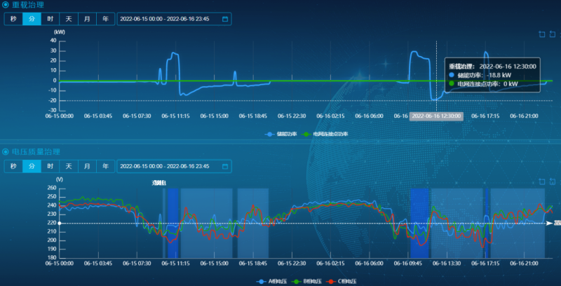 接入移動儲能系統(tǒng)后,通過無功補償、有功補償、三相不平衡治理來抬升線路的功率因數(shù),使電壓穩(wěn)定在220伏左右,當(dāng)臺區(qū)用戶端電壓在正常范圍時,儲能自動充電備用。電壓穩(wěn)定后,居民用電設(shè)備可以正常運行,用電質(zhì)量整體提高,末端低電壓問題迎刃而解。