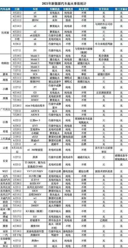 2021年部分新能源汽車火災(zāi)事故統(tǒng)計(jì)