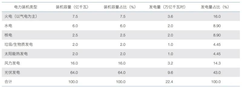 在上述光伏發(fā)電和風(fēng)力發(fā)電總裝機(jī)中,假設(shè)光伏發(fā)電占比 80%(64 億千瓦)、風(fēng)力發(fā)電占比 20%(16 億千瓦),可以得到如表 1 所示的 2060 年我國電源裝機(jī)及發(fā)電量預(yù)測表。