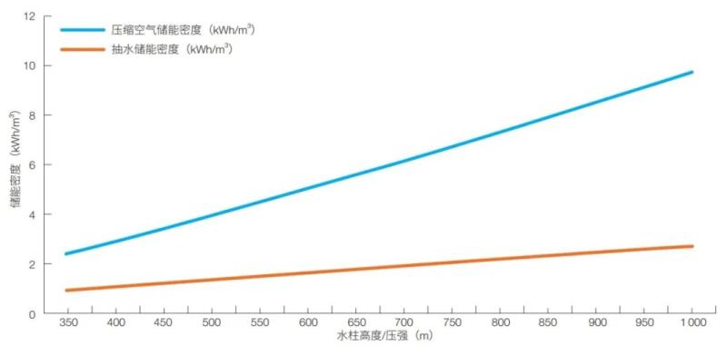 圖 1 抽水儲能與基于水壓補(bǔ)償?shù)膲嚎s空氣儲能系統(tǒng)的能量密度比較