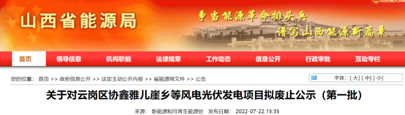 公告表示,省能源局組織各市對(duì)2020年及之前長(zhǎng)期占用資源、遲遲未能建成的風(fēng)電光伏發(fā)電項(xiàng)目進(jìn)行了梳理。相關(guān)地市上報(bào)了本地區(qū)擬廢止項(xiàng)目清單,經(jīng)省能源局匯總,擬將云崗區(qū)協(xié)鑫雅兒崖鄉(xiāng)等54個(gè),總計(jì)規(guī)模138.8萬(wàn)千瓦風(fēng)電光伏發(fā)電項(xiàng)目予以廢止。