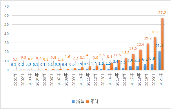 截至2021年底,全球海上風(fēng)電累計(jì)裝機(jī)容量為57.2吉瓦,同比增長(zhǎng)近60%,其中中國(guó)占48%,英國(guó)占22%,德國(guó)占13%。從新增裝機(jī)容量看,2021年呈爆發(fā)式增長(zhǎng),全球海上風(fēng)電新增裝機(jī)容量21.1吉瓦,占全球新增總裝機(jī)容量的比重為22.5%;2021年新增海上風(fēng)電裝機(jī)中中國(guó)占80%,英國(guó)占11%,越南占4%。(見圖1)