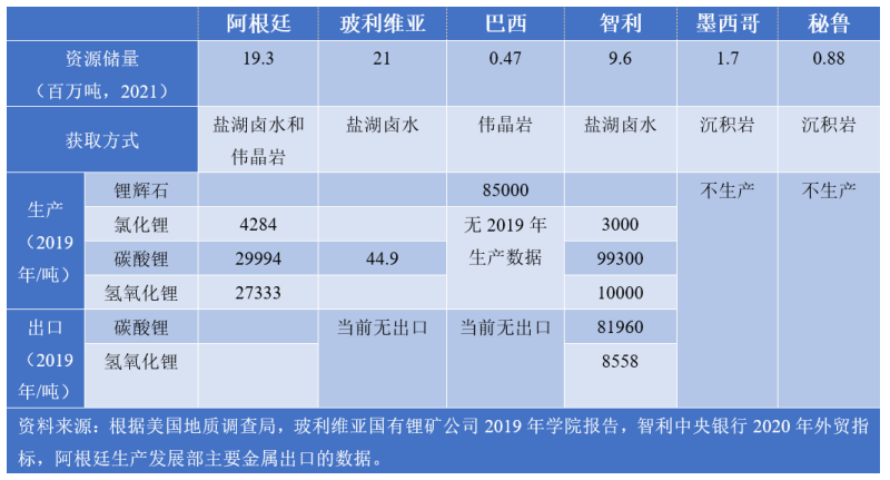 表1 拉丁美洲鋰資源儲量、生產(chǎn)和出口