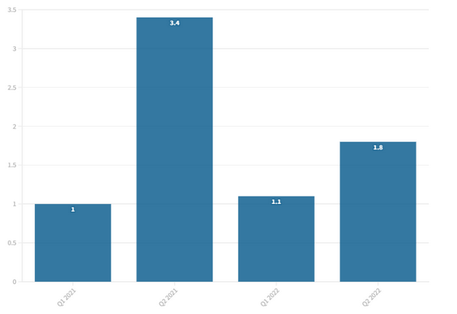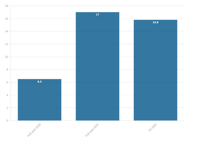 在2022年第一季度表現(xiàn)強(qiáng)勁之后,第二季度增長相對減緩。2022年的上半年總額為158億美元,其中2022年第一季度為129億美元。