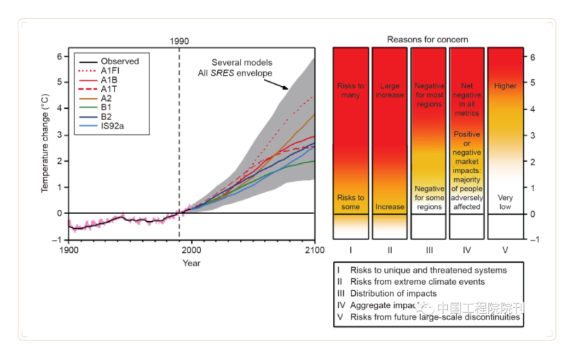 IPCC的評估要求保持政策中立,這使得IPCC傾向于提供有助于讀者對風(fēng)險做出自己判斷的信息,而不是直接就什么構(gòu)成了對“氣候系統(tǒng)受到危險的人為干擾”做出結(jié)論。但相比前三次評估,第四次評估報告對風(fēng)險的解釋和表述更加清晰直觀,如圖2所示。這一階段重要的標(biāo)志,是科學(xué)界強(qiáng)化了氣候變化風(fēng)險評估和價值判斷對確立長期目標(biāo)的重要性,這也推動了政治進(jìn)程上關(guān)于溫升目標(biāo)的討論。