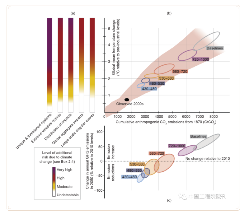 圖3. 到2050年,氣候變化、溫度變化、累積的二氧化碳排放量以及溫室氣體年排放量變化等風(fēng)險之間的關(guān)系:(a)限制關(guān)切理由中的風(fēng)險;(b)意味著限制CO2 累積排放量;(c)可在未來幾十年限制溫室氣體年排放量。