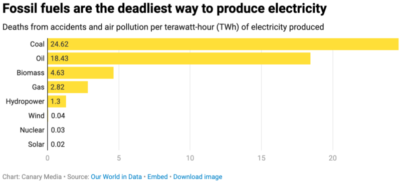 中國儲(chǔ)能網(wǎng)訊:我們說化石燃料是致命的,這不僅僅是因?yàn)樗鼈儗?dǎo)致了氣候危機(jī)。每單位發(fā)電量中,煤炭和石油造成的死亡人數(shù)遠(yuǎn)遠(yuǎn)超過可再生能源或核能——這只是計(jì)算空氣污染和事故造成的死亡人數(shù),而沒有計(jì)入氣候變化引發(fā)的災(zāi)害造成的死亡人數(shù)。