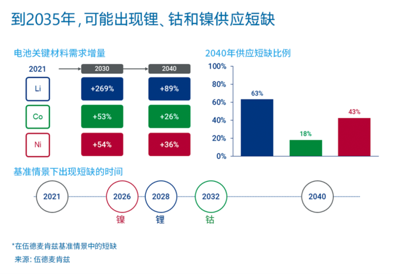 電動汽車是主要的電池需求行業(yè)。我們預測,2030年,電動汽車銷量將達到3,000萬輛,占全球汽車銷量的30%,到2040年,這一比例將進一步上升至52%。因此,電池供應鏈面臨的壓力將與日俱增,鋰、鈷和鎳等電池原材料勢必將供不應求。