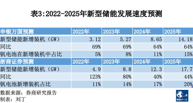 申銀萬國據(jù)此預(yù)測:2022年到2025年,中國新型儲能年新增裝機(jī)量的同比增速將分別達(dá)到69%、69%、64%、64%;浙商證券認(rèn)為同比增速可達(dá)到123%、80%、40%、44%。2025年中國新型儲能年裝機(jī)量中,釩電池儲能的占比可達(dá)到15%到20%。