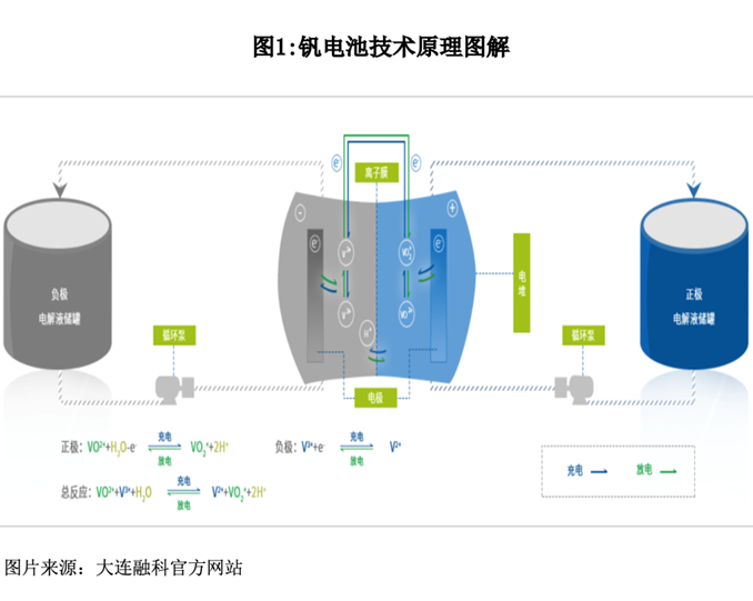 釩電池全稱是全釩氧化還原液流電池。其原理是利用釩氧化物與電極接觸發(fā)生電化學(xué)反應(yīng),使化學(xué)能轉(zhuǎn)換為電能。釩離子電解液含有化學(xué)能,釩電池儲能系統(tǒng)將其儲存在儲罐內(nèi),利用外接的泵,將電解液從儲罐壓入電池堆體內(nèi),使得電解液平行流過電極表面并發(fā)生電化學(xué)反應(yīng),從而完成釩電池儲能系統(tǒng)的充電或放電。