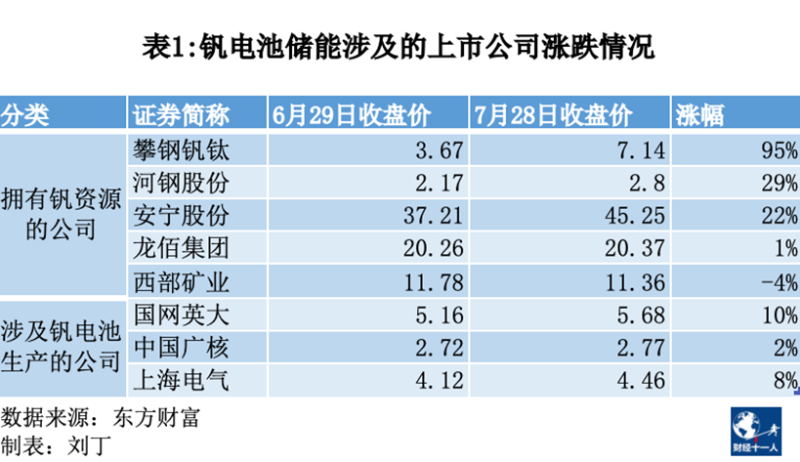 近日,釩電池概念帶動若干股票大幅波動。尤其是釩資源龍頭企業(yè)攀鋼集團(tuán)釩鈦資源股份有限公司(000629.SZ,下稱攀鋼釩鈦),其股價自6月29日以來接近翻倍。