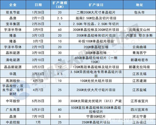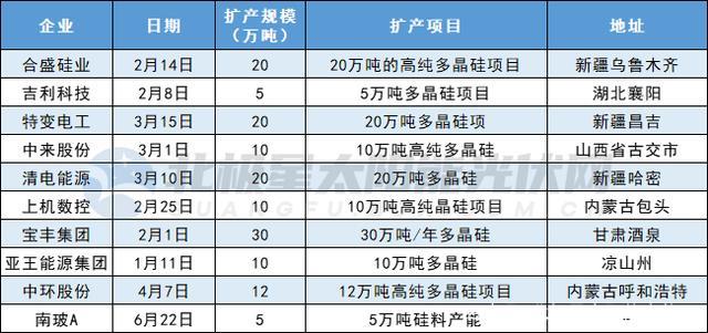 在今年宣布擴(kuò)產(chǎn)的十家企業(yè)中,除了老玩家特變電工以外,市場(chǎng)迎來了九家跨界而來企業(yè)的投資簇?fù)?。其中,寶豐集團(tuán)投資規(guī)模最大,擴(kuò)產(chǎn)規(guī)劃達(dá)30萬(wàn)噸;特變電工、合盛硅業(yè)緊隨其后,擴(kuò)產(chǎn)規(guī)劃均達(dá)20萬(wàn)噸;硅片龍頭中環(huán)股份擴(kuò)產(chǎn)規(guī)模達(dá)12萬(wàn)噸;中來股份、上機(jī)數(shù)控、亞王能源集團(tuán)擴(kuò)產(chǎn)規(guī)模均達(dá)10萬(wàn)噸,吉利科技、南玻A擴(kuò)產(chǎn)規(guī)模均達(dá)5萬(wàn)噸。