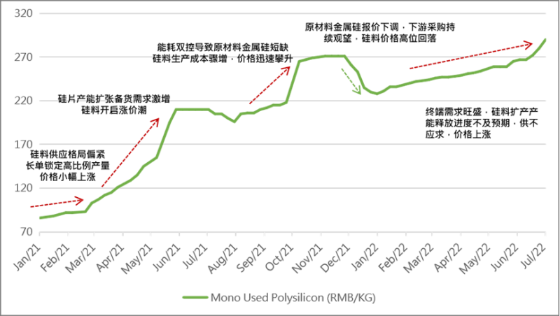 7月27日,中國有色金屬工業(yè)協(xié)會硅業(yè)分會公布了太陽能級多晶硅最新價格,其中,國內(nèi)單晶復(fù)投料價格區(qū)間在288-310元/kg,成交均價為297.6元/kg;單晶致密料價格區(qū)間在286-308元/kg,成交均價為295.5元/kg;單晶菜花料價格區(qū)間在283-306元/kg,成交均價為292.7元/kg。相較于2021年年初的8萬元/噸,漲幅接近4倍,再創(chuàng)新高。