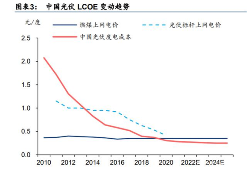 光伏行業(yè)最大的發(fā)展動力是“平價”。從 2010 年的 0.381美元/kWh 到 2020 年的 0.057美元/kWh,光伏LCOE(平準(zhǔn)化度電成本)下降近 90%,是過去十年LCOE 下降最快的清潔能源。也正是基于此,2021年,光伏行業(yè)補貼順利退出,進入全面平價時代。