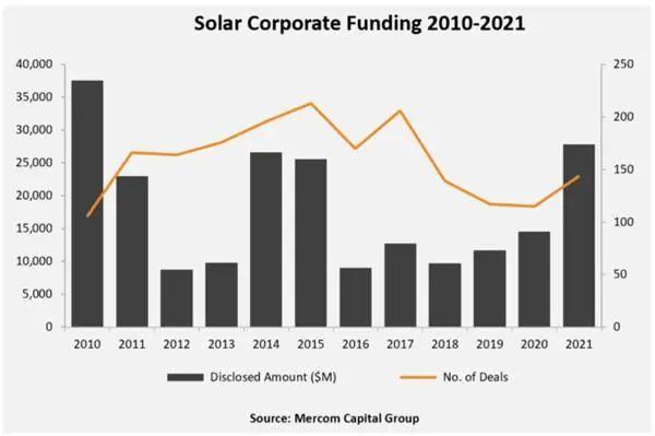 碳中和為光伏行業(yè)鋪好了長達30年的黃金發(fā)展期,長坡厚雪,行業(yè)空間和成長性毋庸置疑。2021年,全球太陽能行業(yè)企業(yè)融資總額(包括風(fēng)險投資和私募股權(quán)、債務(wù)融資和公開市場融資)達到278億美元,同比增長了91%,創(chuàng)下10年來最高紀(jì)錄。這項數(shù)據(jù)是市場繁榮的信號,但也可能是供過于求的伏筆。