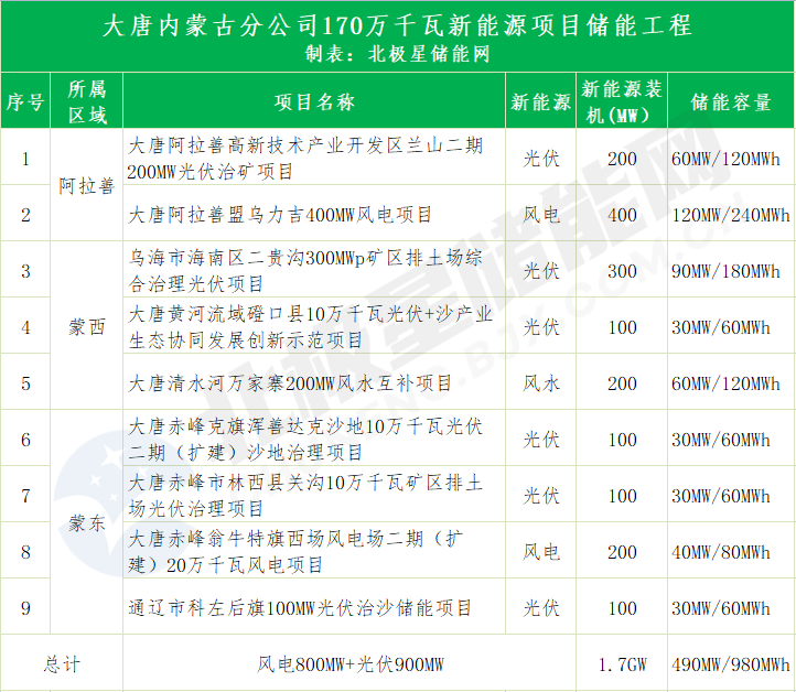 蒙東區(qū)域標段:包括大唐赤峰克旗渾善達克沙地10萬千瓦光伏二期(擴建)沙地治理項目,配套儲能容量30MW/60MWh,大唐赤峰市林西縣關溝10萬千瓦礦區(qū)排土場光伏治理項目,配套儲能容量30MW/60MWh,大唐赤峰翁牛特旗西場風電場二期(擴建)20萬千瓦風電項目,配套儲能容量40MW/80MWh,通遼市科左后旗100MW光伏治沙儲能項目,配套儲能容量30MW/60MWh,四個項目合計配套儲能容量為130MW/260MWh。