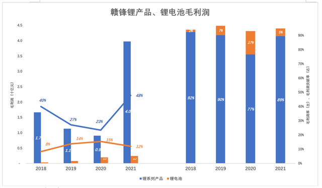 2021年,贛鋒鋰電池業(yè)務(wù)毛利潤(rùn)約2.4億、占毛利潤(rùn)總額的5%,毛利潤(rùn)率不到12%(寧德時(shí)代動(dòng)力電池毛利潤(rùn)率為22%)。同期,天齊鋰礦業(yè)務(wù)毛利潤(rùn)達(dá)16.4億、占毛利潤(rùn)總額的34.5%。