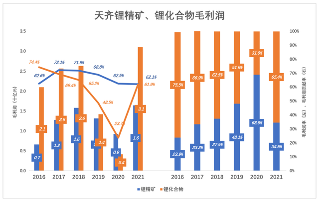 2021年,鋰化合物毛利潤(rùn)率回升到62%,毛利潤(rùn)31億、對(duì)整體毛利潤(rùn)的貢獻(xiàn)率為65.4%。