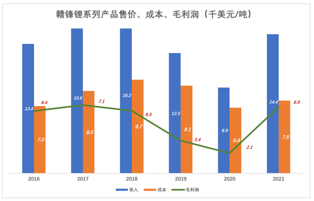以2017年為例,天齊每噸鋰礦石毛利潤(rùn)為465美元,贛鋒每噸產(chǎn)品毛利潤(rùn)7100美元,毛利潤(rùn)率45.4%。再看2021年,贛鋒鋰產(chǎn)品銷售均價(jià)折合1.44萬(wàn)美元、毛利潤(rùn)6880美元、毛利潤(rùn)率47.8%。