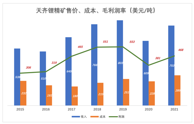 2021年,鋰精礦銷售價(jià)格同比增長(zhǎng)23.7%、至753美元/噸(低于2018年、2019年),而采購(gòu)價(jià)格增長(zhǎng)25.1%、創(chuàng)紀(jì)錄地達(dá)到285美元/噸;毛利潤(rùn)468美元/噸、利潤(rùn)率62.1%(較2017年峰值低10個(gè)百分點(diǎn))。